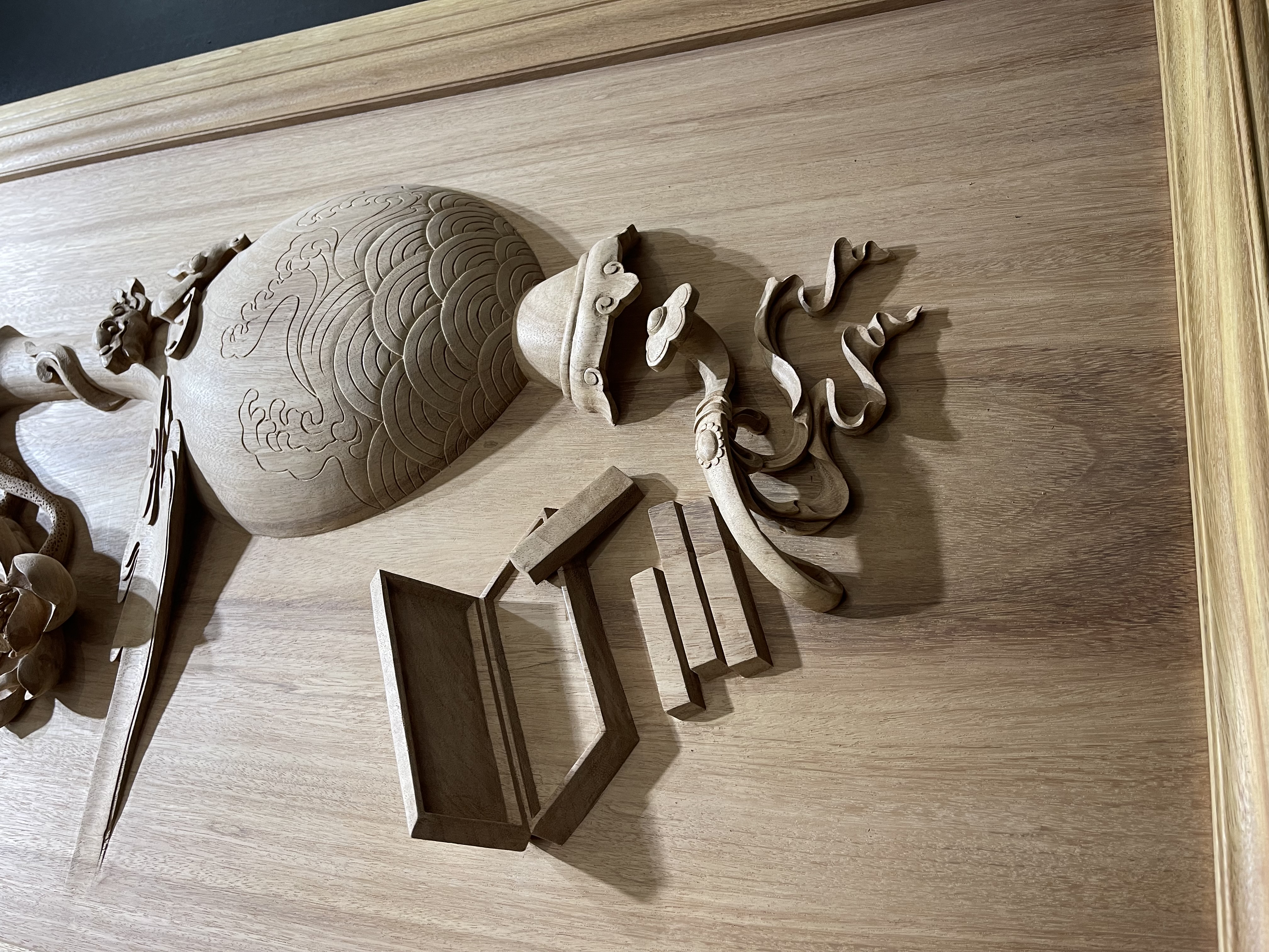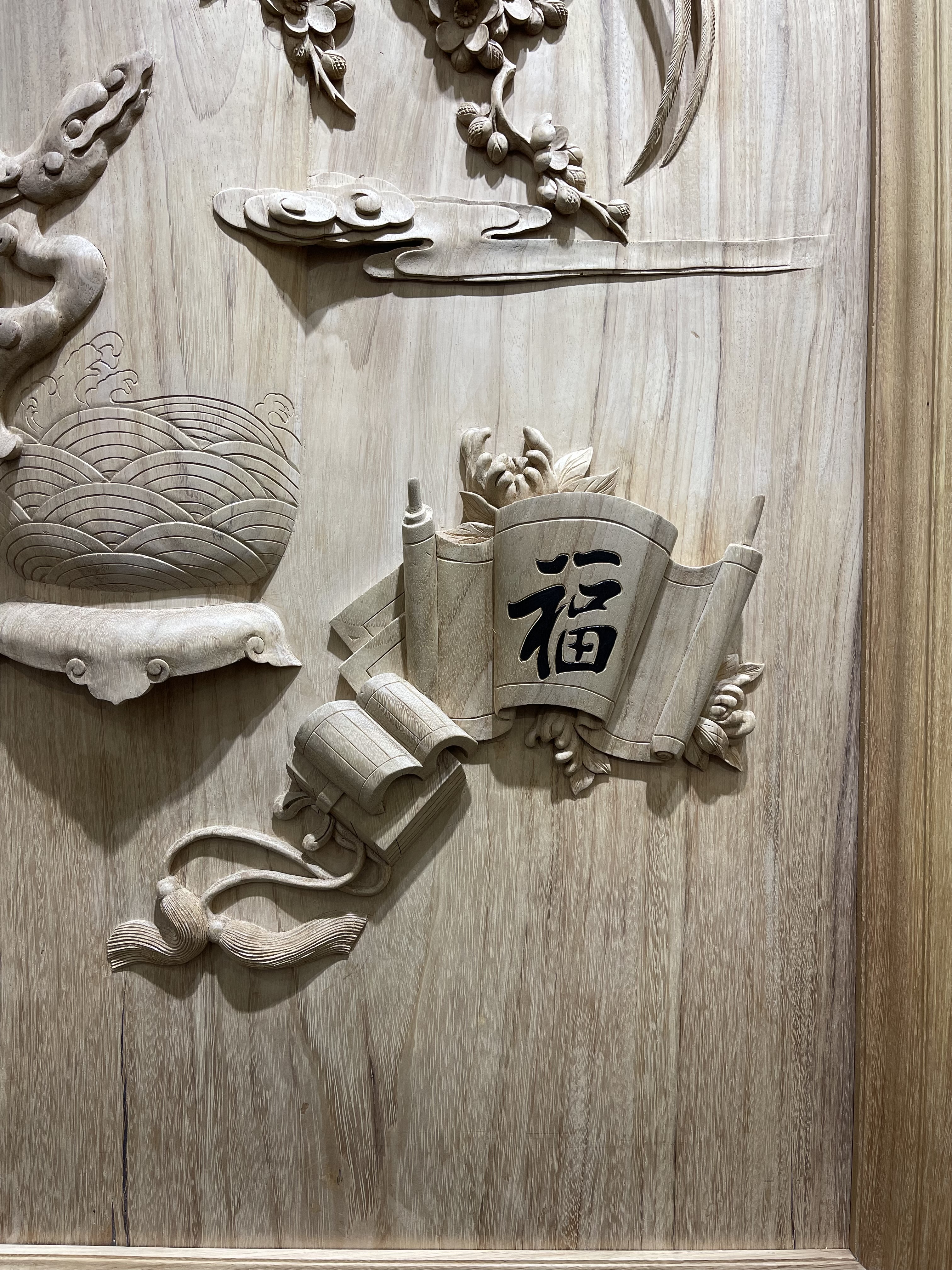 Tác phẩm được thực hiện hoàn toàn bằng đục tay thủ công, từng nếp gỗ có nhịp thở, từng lớp chạm có hồn vía, vừa cổ kính vừa sang trọng. Đây là một bức phúc vật trấn gia, nâng đỡ khí vận, điều hòa không gian sống.