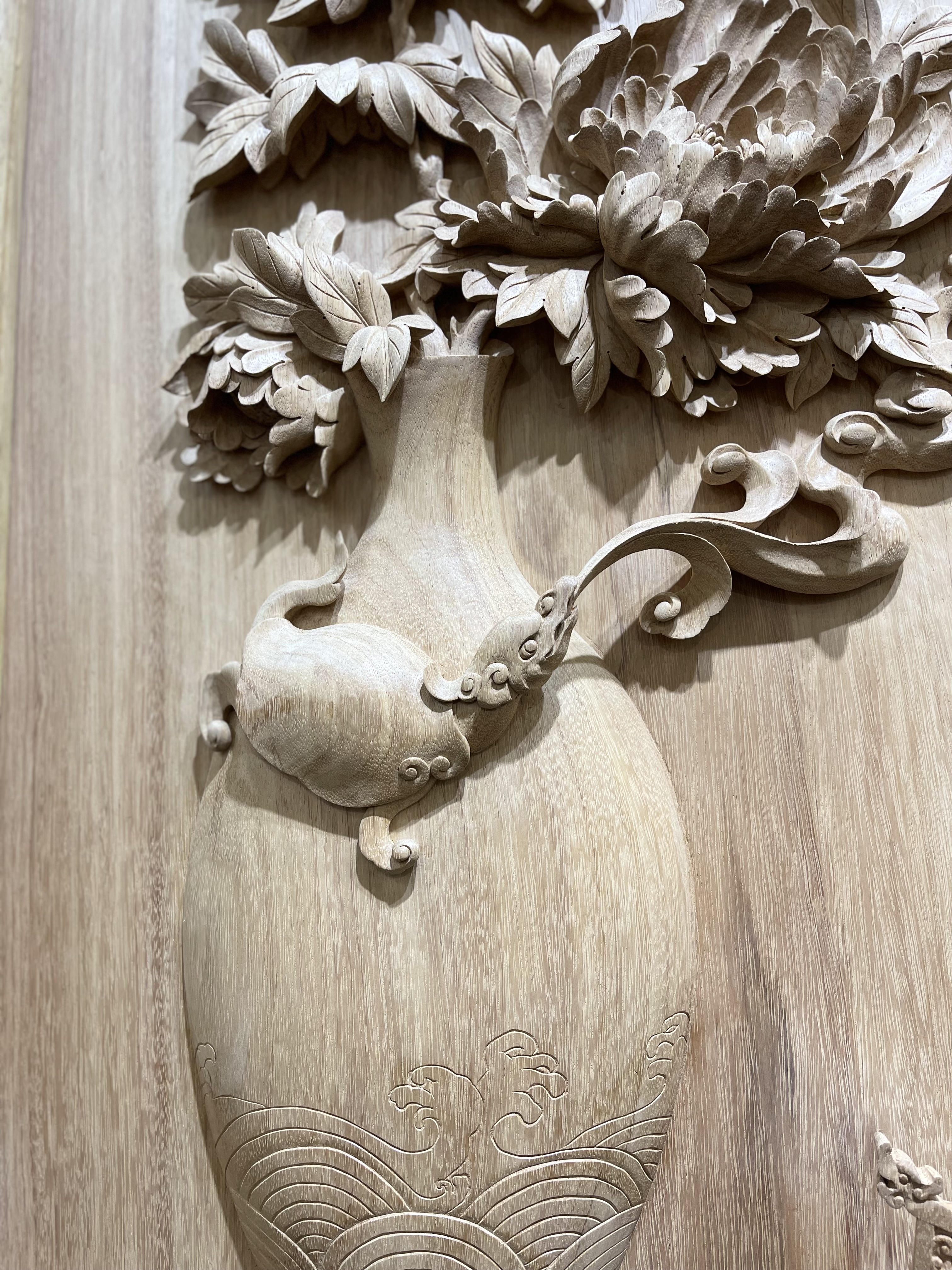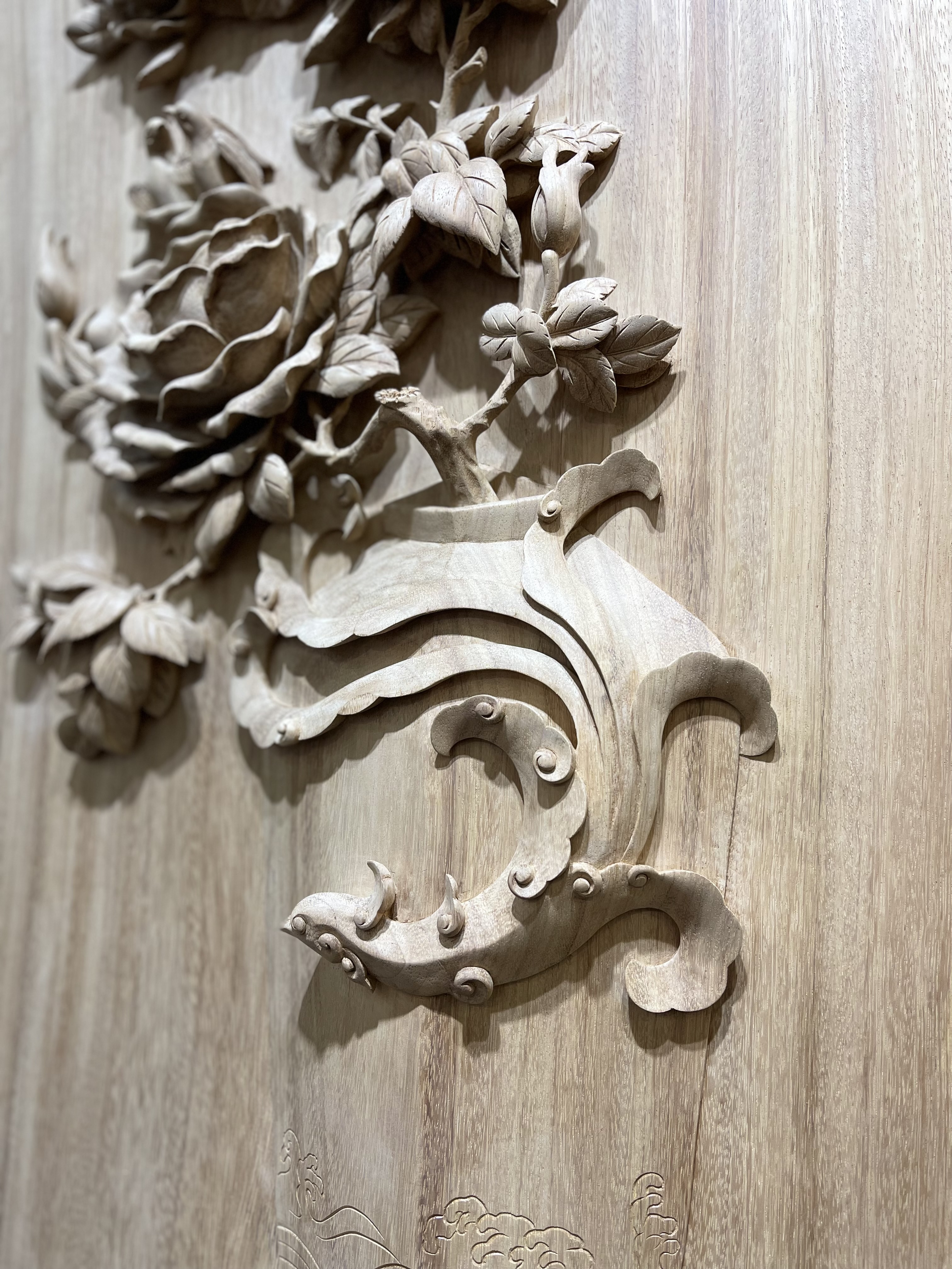 Nổi bật giữa bố cục là những đóa mẫu đơn khai hoa, từng cánh mỏng tơi, mềm mại như gấm vóc, được nghệ nhân đục chạm công phu đến từng chi tiết. Mẫu đơn – được tôn xưng là “Quốc sắc thiên hương” – biểu trưng cho vinh hoa, phú quý, khí chất vương giả. Hoa nở hàm ý vận mở, lộc tụ, thịnh khí dâng tràn.